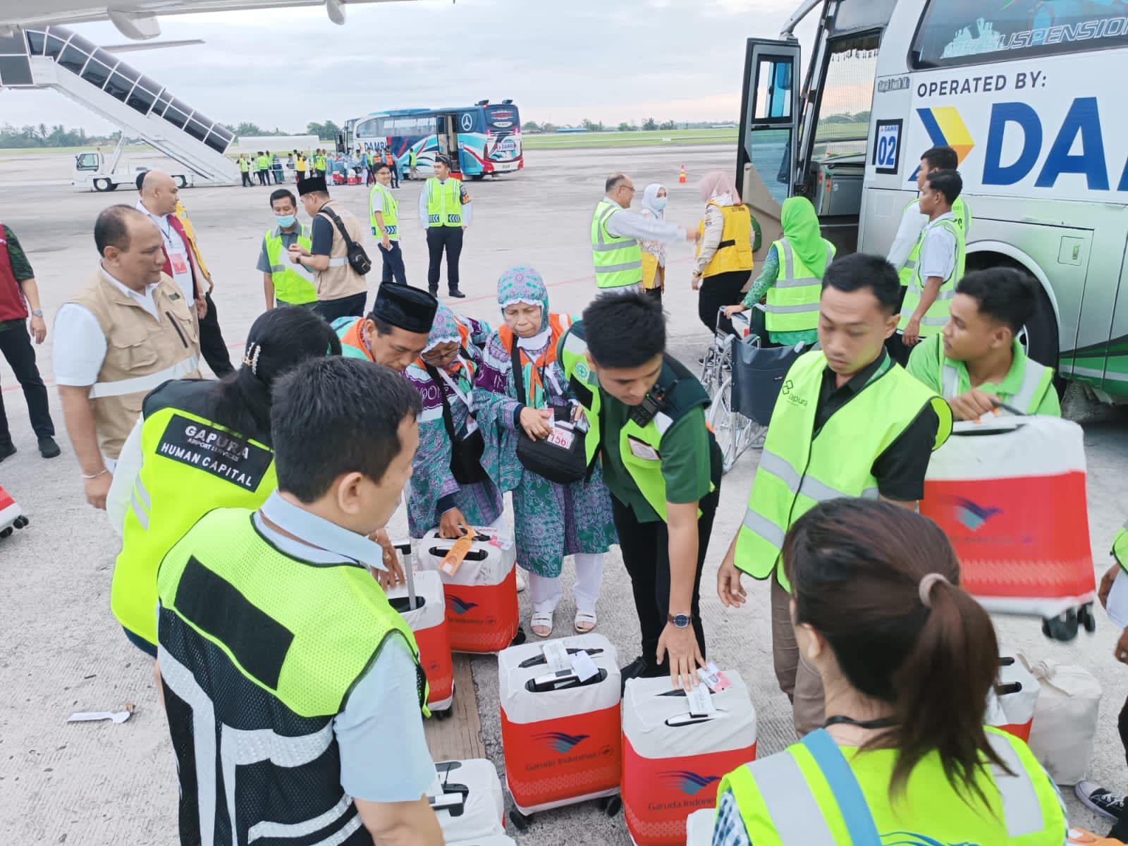 Sepuluh bus pariwisata mengantar calon jemaah dari asrama haji hingga apron (tempat parkir pesawat), di mana para calon penumpang telah menjalani berbagai pemeriksaan seperti x-ray barang bawaan, pemeriksaan kesehatan, dan pengecekan paspor di asrama haji.