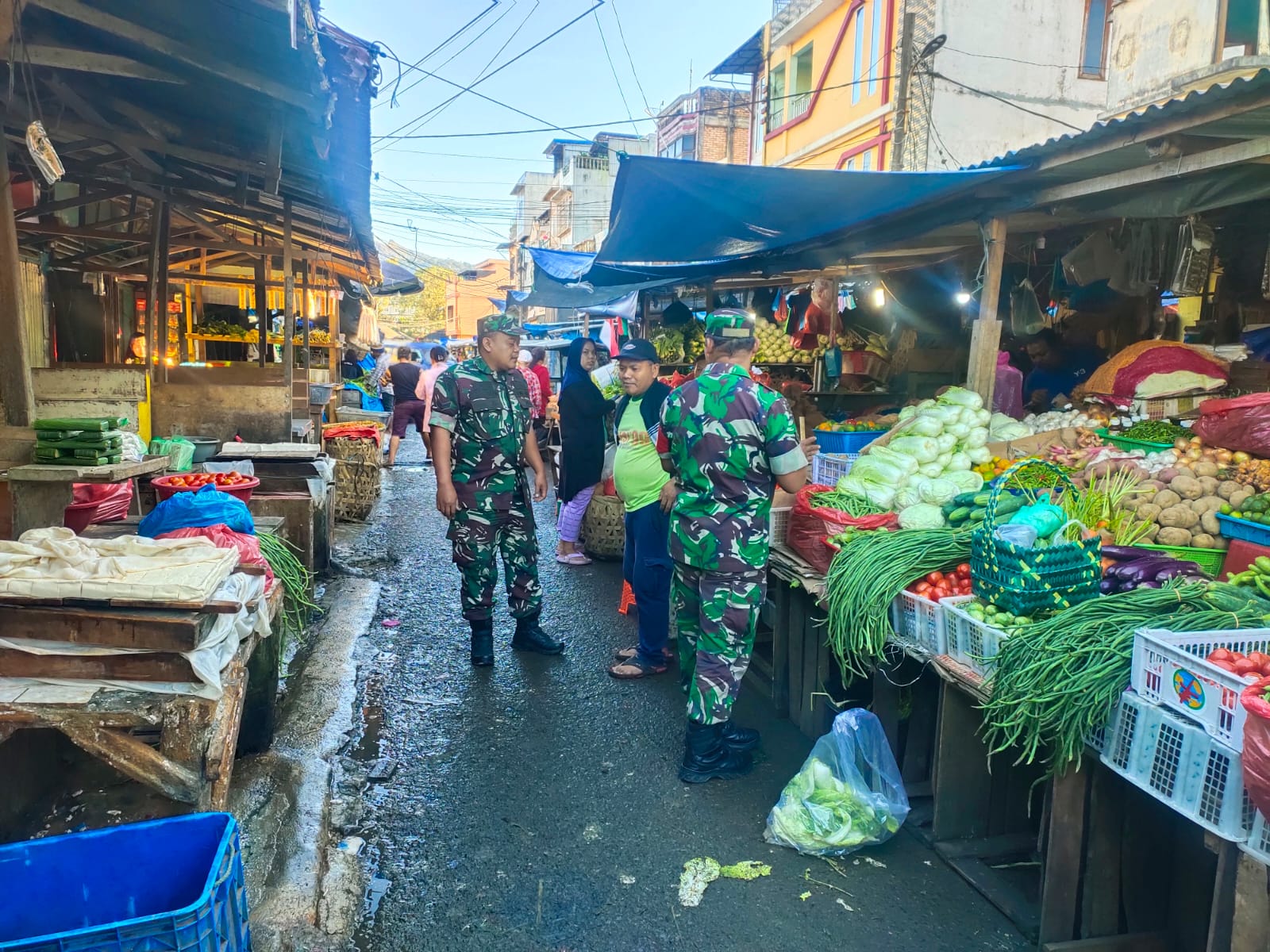 MAWARTANEWS.com, KARO [ Hadir sapa pagi Babinsa Koramil 03/Berastagi di Pusat Pasar Berastagi memberikan rasa nyaman dan tentram kepada para pedagang,dengan santun dan ramah senyum dua Personil Babinsa 03/Berastagi menyapa serta berkeliling berpatroli rutin Sertu Hengky dan Sertu Irwansyah Tarigan melakukan giat patroli di seputaran Pusat Berastagi untuk mencegah adanya pencopetan di Pusat Pasar Berastagi di Kelurahan Tambak Lau Mulgap II Berastagi (11/8).