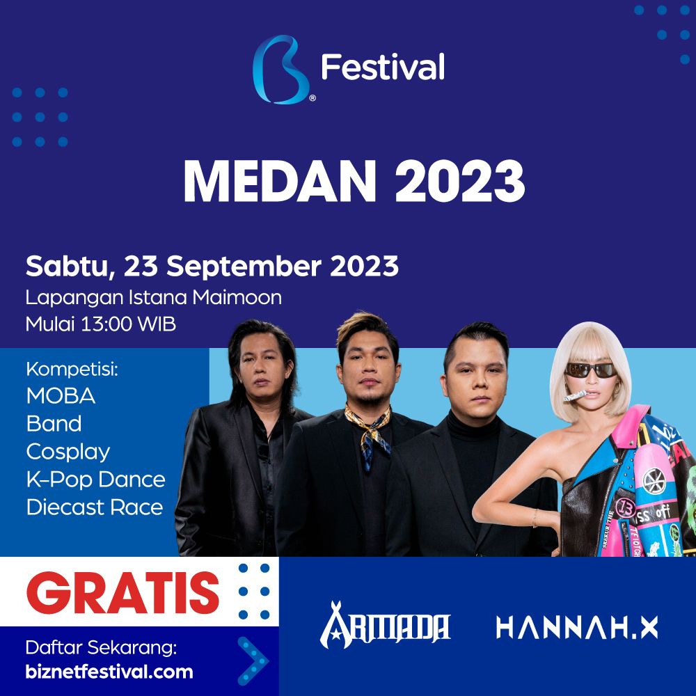Biznet Festival Medan 2023 tentunya akan hadir lebih seru dengan berbagai kegiatan hiburan seperti Kompetisi Band, MOBA, K-Pop Dance, Diecast Race dan juga Cosplay serta penampilan dari salah satu band top tanah air, Armada dan DJ Hannah X.