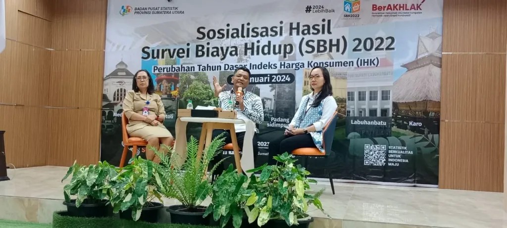 Demikian disampaikan Kepala BPS Sumut, Nurul Hasanudin dalam sosialisasi hasil Survei Biaya Hidup (SBH) 2022, perubahan tahun dasar Indeks Harga Konsumen (IHK) di Gedung BPS Sumut, Jalan Asrama, Kota Medan, Selasa (30/01/2024).