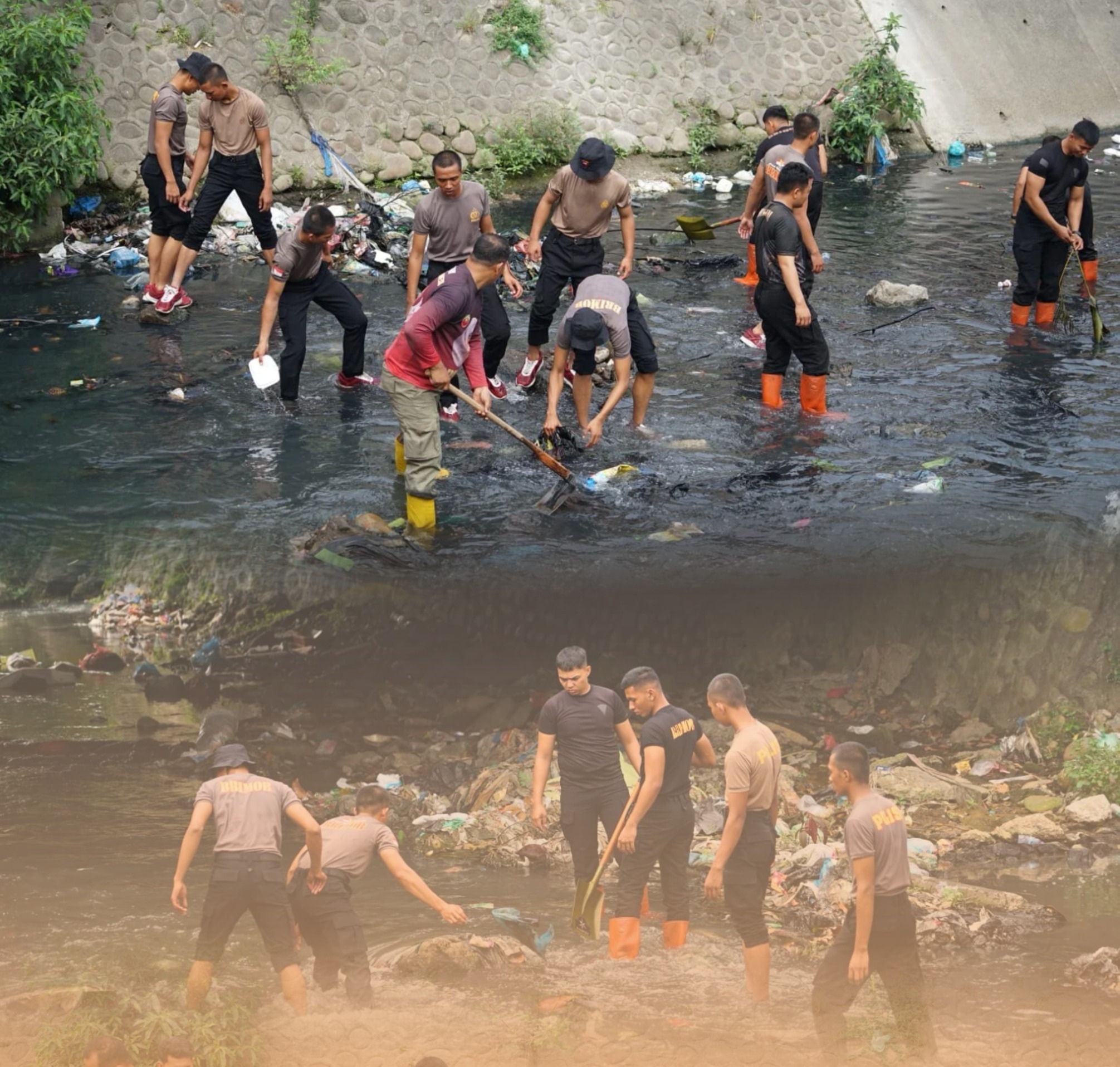 Dengan semangat gotong royong dan pengabdian tanpa pamrih, personel Brimob bahu-membahu membersihkan tumpukan sampah yang mengendap di sekitar aliran sungai.