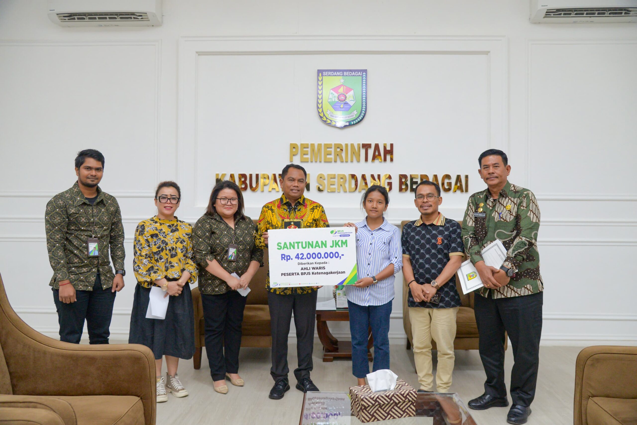 Bupati Serdang Bedagai (Sergai) H. Darma Wijaya menyerahkan secara simbolis santunan Jaminan Kematian Badan Penyelenggara Jaminan Sosial Ketenagakerjaan (JKM BPJS Tk) kepada dua ahli waris, bertempat di Kantor Bupati Sergai, Sei Rampah, Kamis (4/4/2024) Kemarin.
