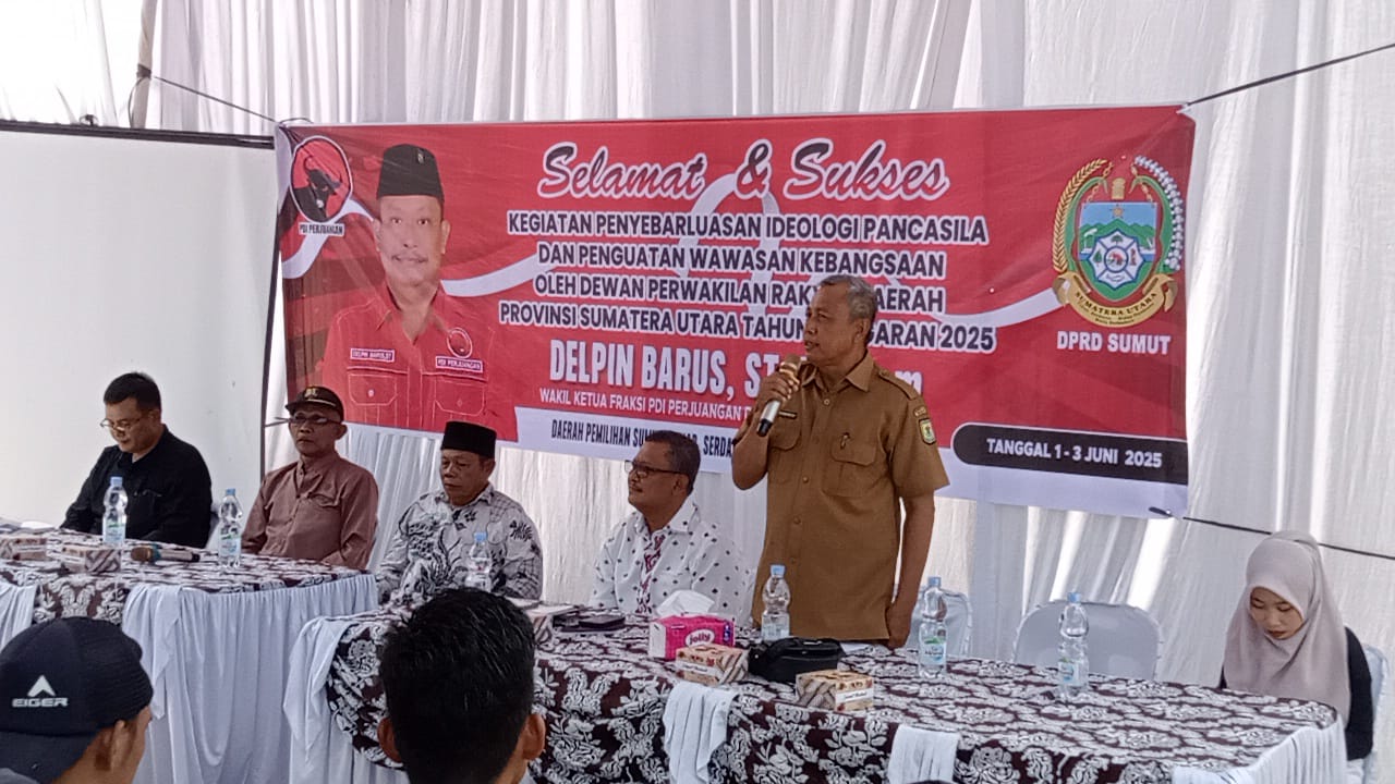SERGAI – Anggota DPRD Provinsi Sumatera Utara dari Fraksi PDI Perjuangan, Delfin Barus ST, menggelar kegiatan sosialisasi penyebarluasan ideologi Pancasila dan penguatan wawasan kebangsaan di Dusun II, Desa Lestari Dadi, Kecamatan Pegajahan, Kabupaten Serdang Bedagai, Senin (2/6/2025).