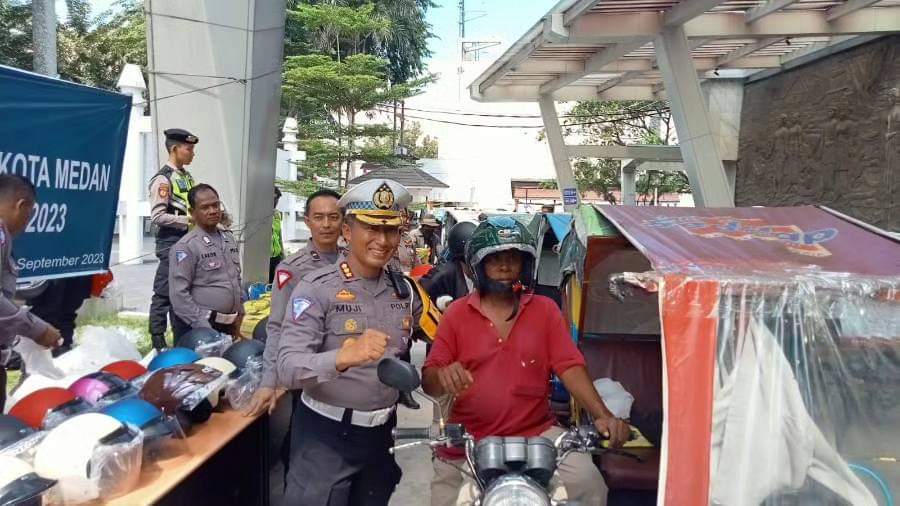 Direktorat Lalu Lintas (Ditlantas) Polda Sumut membagikan 200 helm Standar Nasional Indonesia (SNI) kepada para abang beca bermotor (betor) yang beroperasi di kota Medan khususnya, Senin (11/9) siang.