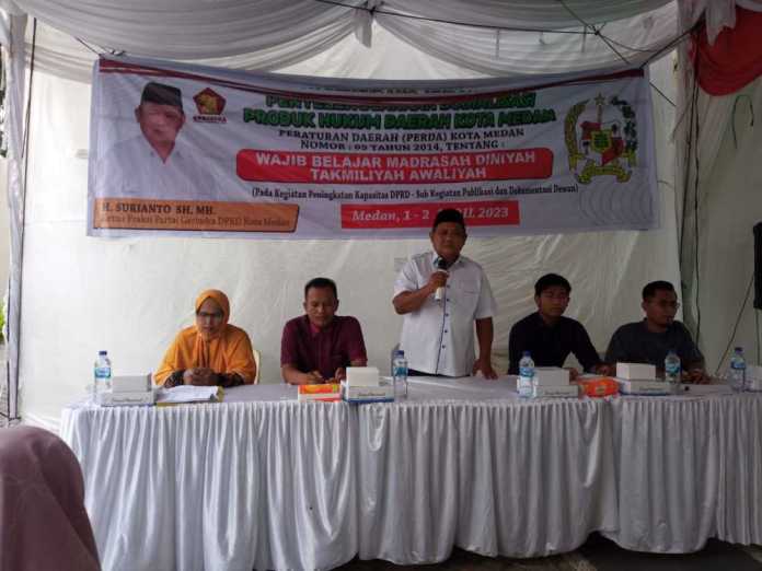 Anggota Dewan Perwakilan Rakyat Daerah (DPRD) Kota Medan, Surianto SH, laksanakan Sosialisasi Peraturan Daerah (Sosper) No 5 Tahun 2014 tentang wajib belajar Madrasah Diniyah Takmiliyah Awaliyah (MDTA), di kediamannya jalan Jagung lingkungan 8, kelurahan terjun kecamatan Medan Marelan, Sabtu dan Minggu, (1 dan 2 Maret 2023)