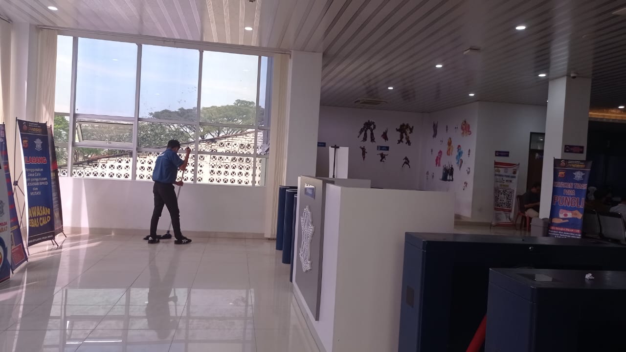 Meski sudah membersihkan mulai dari Basement hingga ruang layanan dan lainnya di Gedung BPKB Polda Jabar, Asep Sopiandani bersama rekannya tetap standby untuk memastikan kondisi kebersihan tetap terjaga dengan baik.