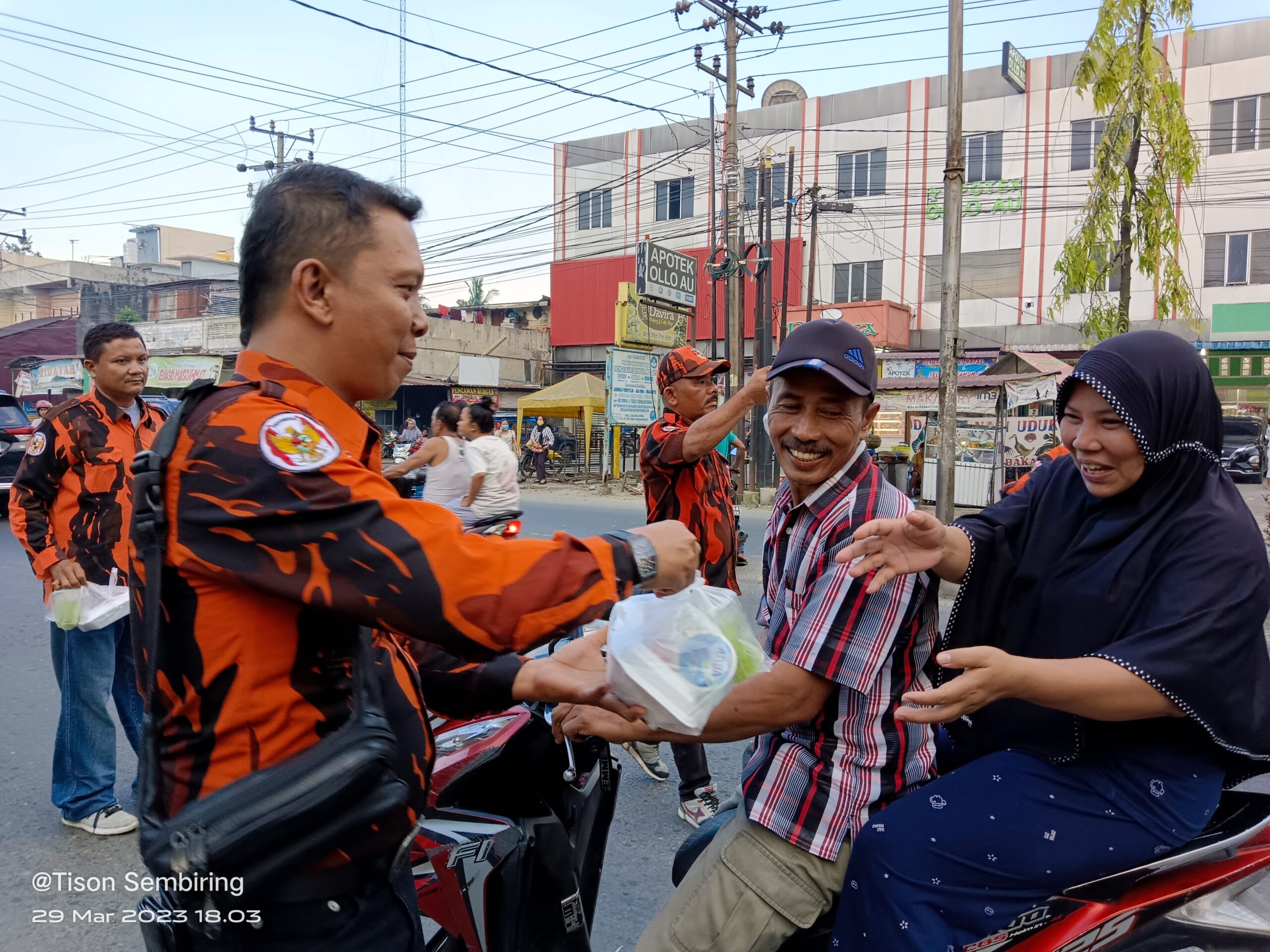 Ketua PAC PP Medan Tuntungan Sempurna Sembiring bagikan takjil ke pengendara sepeda motor di simpang pencawan, Rabu (29/03). (Foto: Mattanews/Tison Sembiring)
