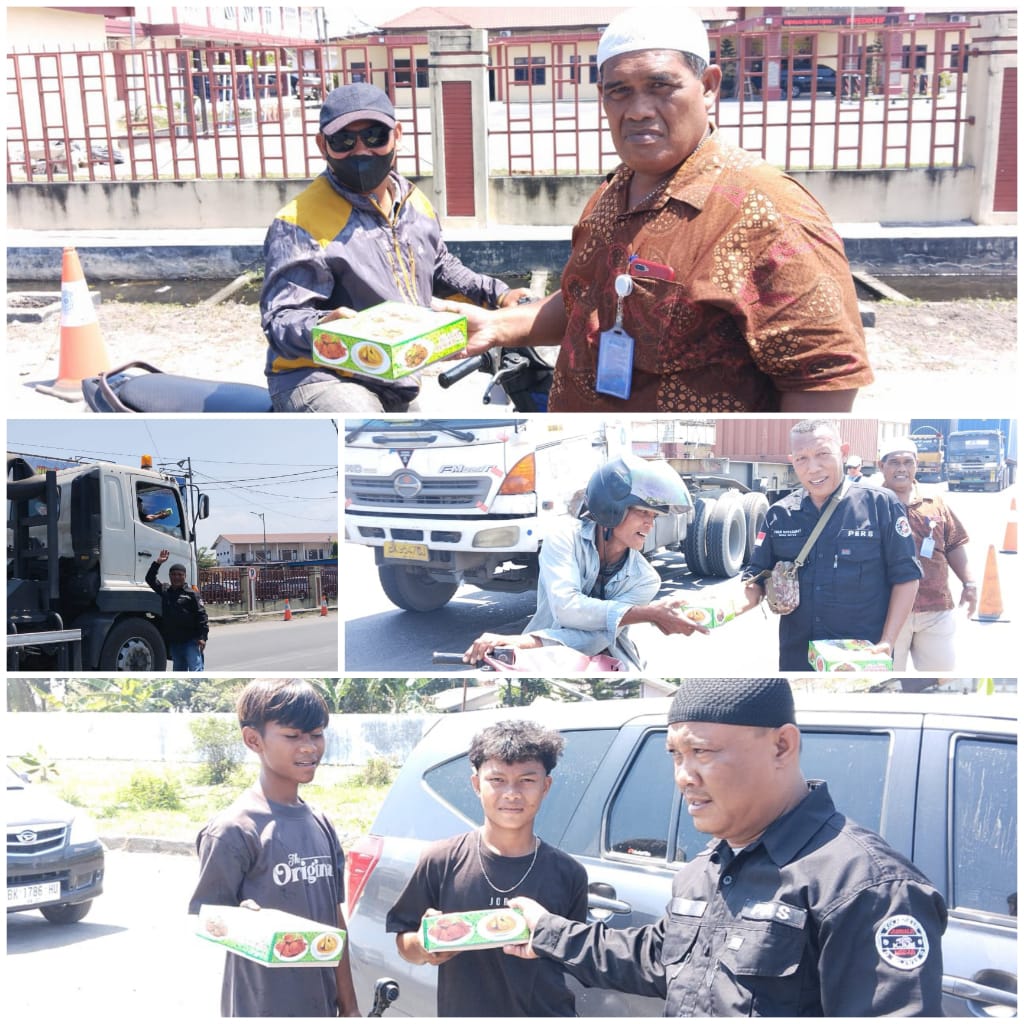 Sebanyak puluhan nasi kotak dibagikan kepada masyarakat yang melintas di jalan pelabuhan raya , Kelurahan Bagan Deli, Kecamatan Medan Belawan, persis didepan Kantor Mako Polres Pelabuhan Belawan.