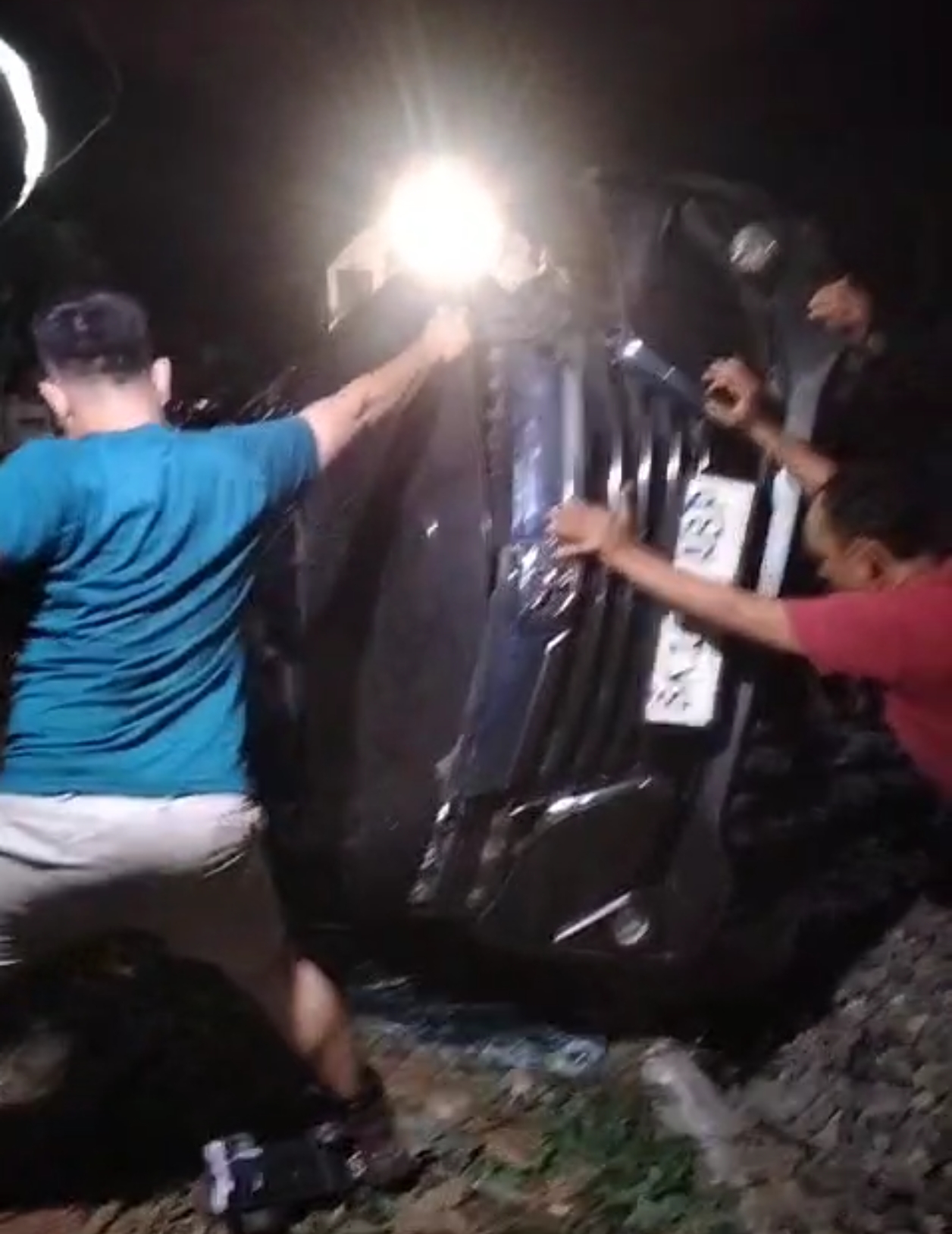 Petugas KAI bersama kepolisian dan dibantu warga sekitar melakukan evakuasi minibus agar jalur kereta api kembali aman dilalui.