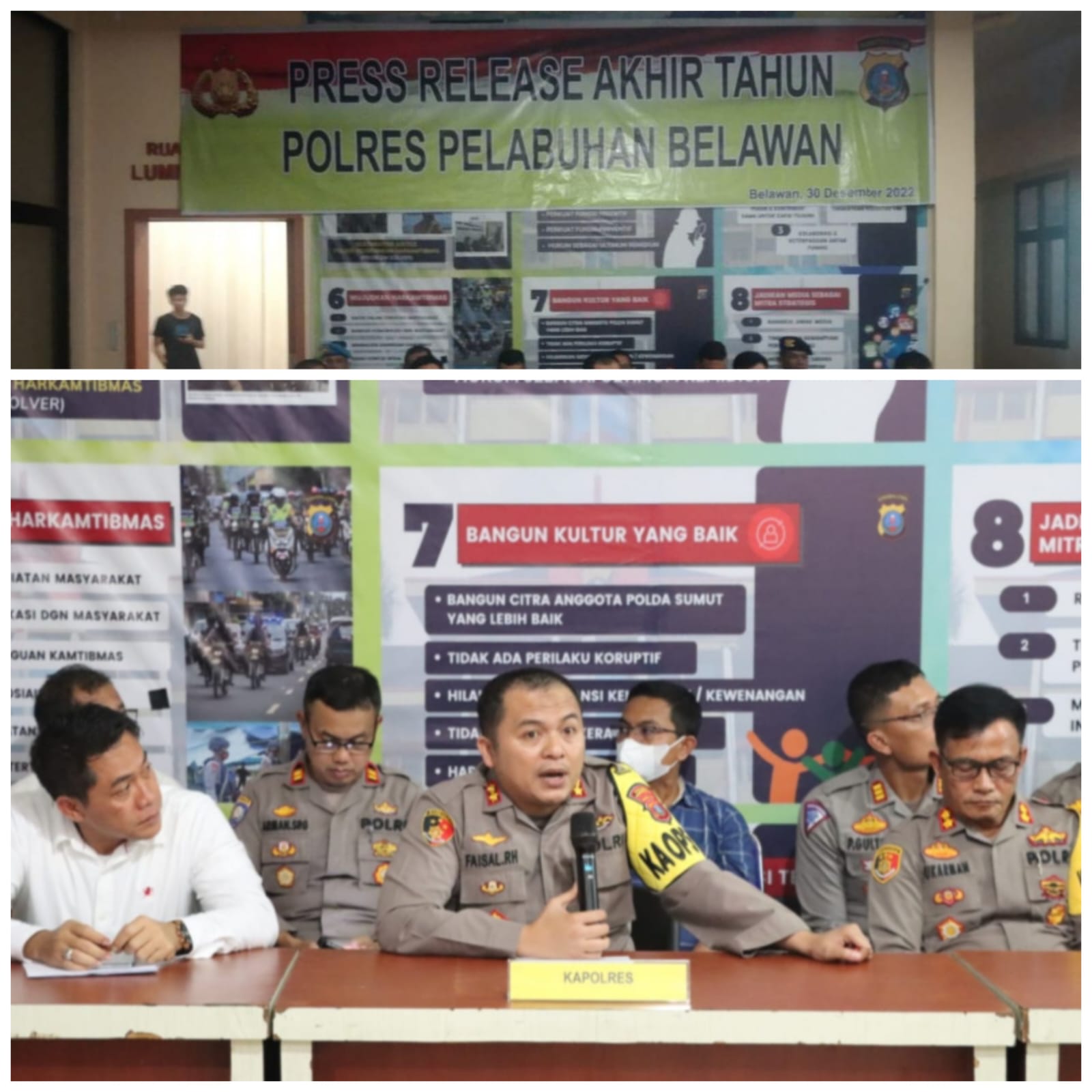 MAWARTANEWS.com, Belawan – Polres Pelabuhan Belawan berhasil penyelesaian sebanyak 1.674 perkara tindak pidana kejahatan selama tahun 2022. Hal tersebut diungkapkan oleh Kapolres Pelabuhan Belawan AKBP Faisal Rahmat pada konferensi pers akhir tahun 2022 oleh Polres Pelabuhan Belawan, Jumat (30/12/2022)