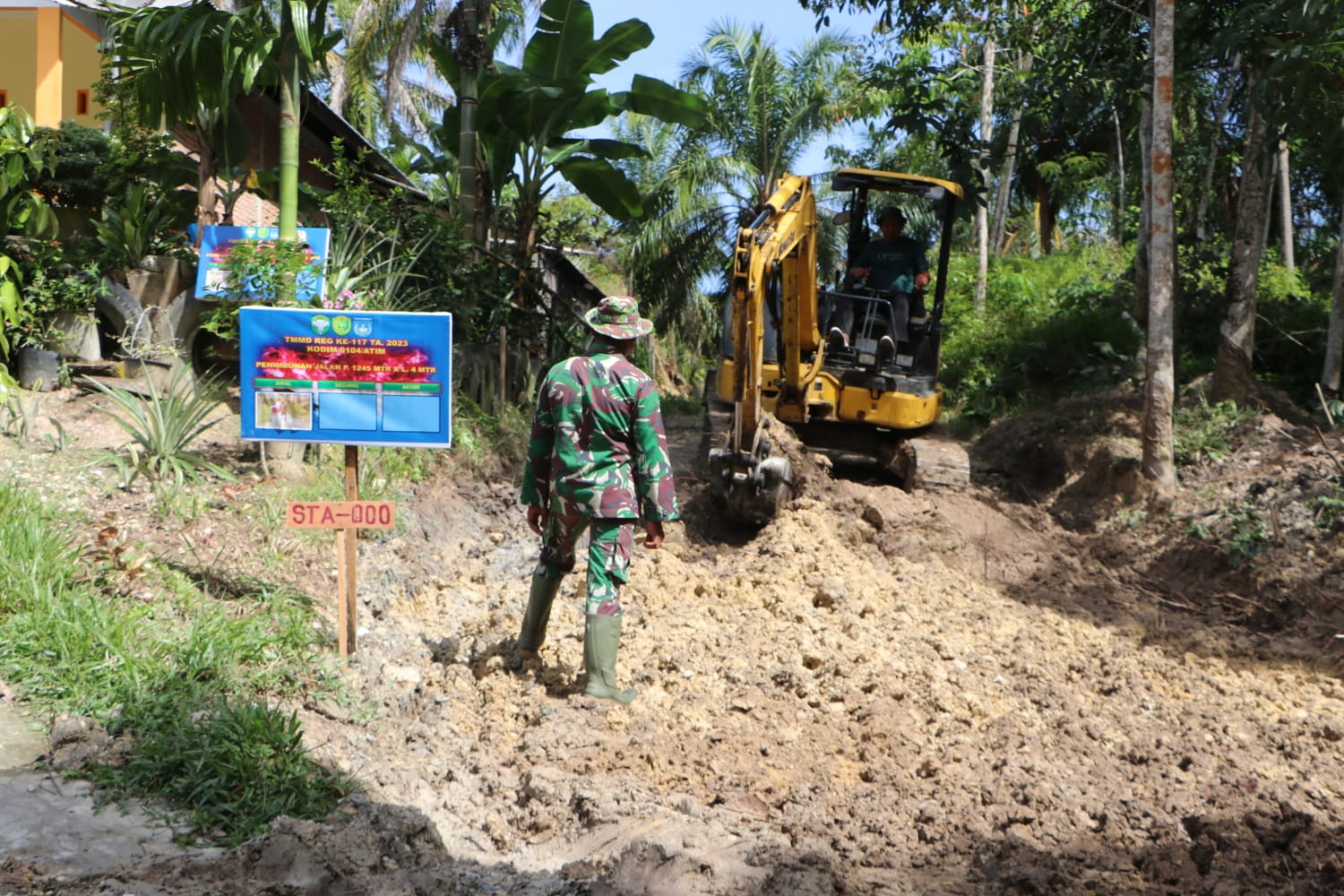 Satuan Tugas (Satgas) TMMD ke 117 Kodim 0104/Aceh Timur mengerahkan alat berat guna mempercepat kegiatan fisik di Desa Sukajadi Kebon Ireng, Kecamatan Langsa Lama, Kota Langsa, Sabtu (15/07/2023).