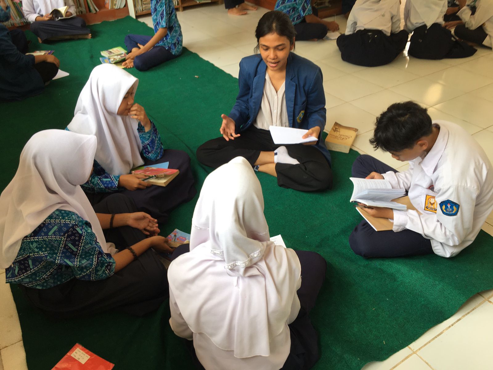 Kegiatan peningkatan literasi bersama mahasiswa KKNT Ukrida di perpustakaan SMPN 2 Cugenang.
