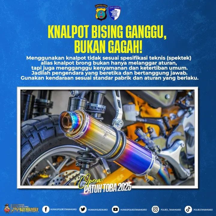 Dalam rangka pelaksanaan Operasi Patuh Toba 2025, personel Satlantas melaksanakan penindakan tegas terhadap kendaraan bermotor yang menggunakan knalpot tidak sesuai spesifikasi teknis alias knalpot bising.