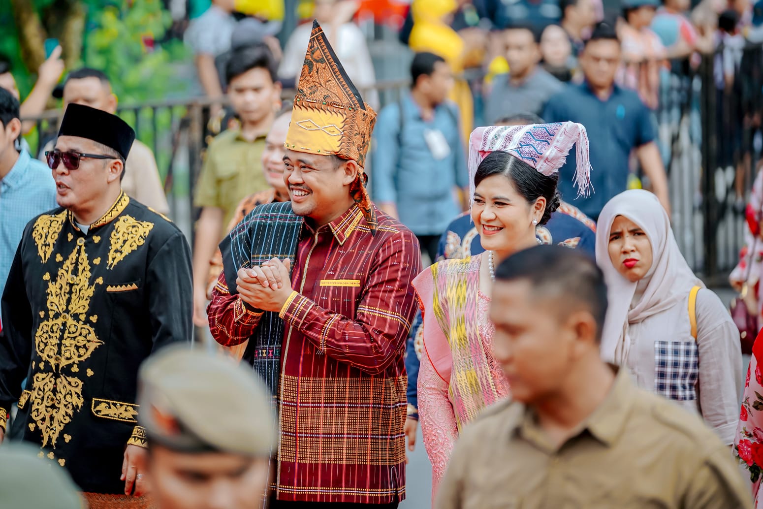 Dengan mengenakan pakaian adat Simalungun, Wali Kota Medan Bobby Nasution bersama Ketua TP PKK Kota Medan Ny Kahiyang Ayu mengikuti Pawai Colorful Medan Carnival yang digelar dalam rangka memeriahkan Hari Jadi ke-433 Kota Medan, Sabtu (8/7).