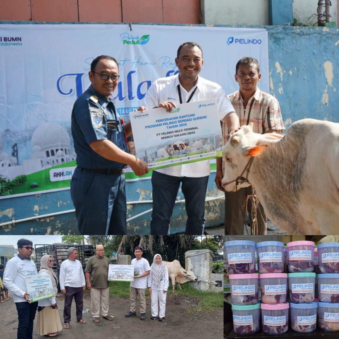 MEDAN – PT Pelindo Multi Terminal (SPMT) Grup, Subholding PT Pelabuhan Indonesia (Persero) yang bergerak di bidang terminal nonpetikemas, kembali menyalurkan bantuan hewan qurban kepada masyarakat dalam rangka perayaan Hari Raya Iduladha 1446 H. Melalui program Tanggung Jawab Sosial dan Lingkungan (TJSL) bertajuk “Pelindo Berbagi Qurban 2025”, sebanyak 90 hewan qurban berupa 77 ekor sapi dan 13 ekor kambing yang disalurkan ke berbagai wilayah kerja Pelindo Multi Terminal Grup yang tersebar di seluruh Indonesia (11/06/25).