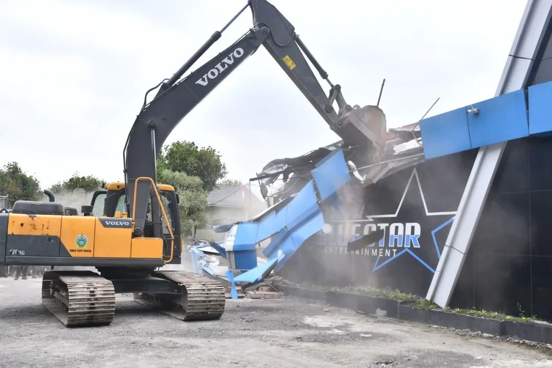Begitu surat perintah eksekusi dibacakan, satu unit ekskavator langsung bekerja merobohkan bangunan megah itu. Prosesnya berjalan lancar tanpa perlawanan, hingga bangunan rata dengan tanah.