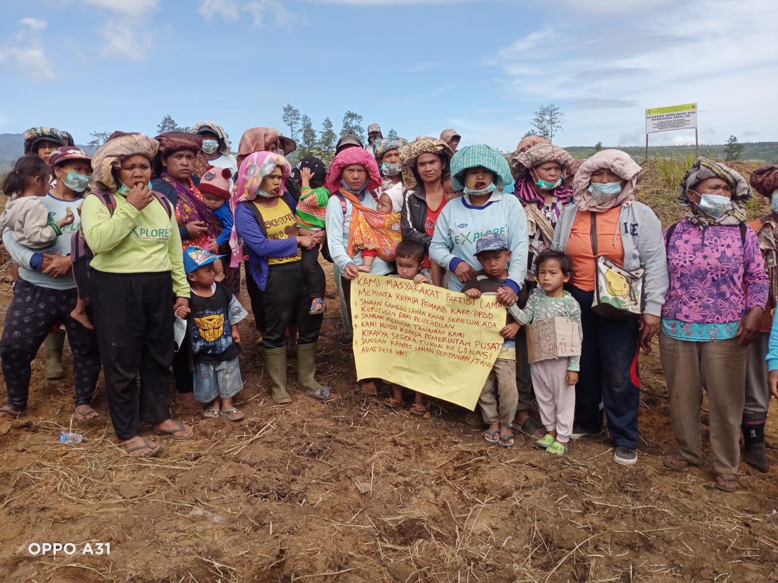 Namun pagi tadi Kamis 28/07/2022 sempat diberhentikan oleh Emak – Emak Desa Pertibi Kec Merek Kab Karo dan mereka mengatakan di dalam spanduknya yang bertuliskan ” Jokowi tanah kami di ambil , Pak Jokowi kami tidak bisa beli susu anak kami, Kami tidak makan, tanaman kami dirusak makan apa kami, tolong kami Pak Jokowi, Tolong kami Pak Jokowi!.