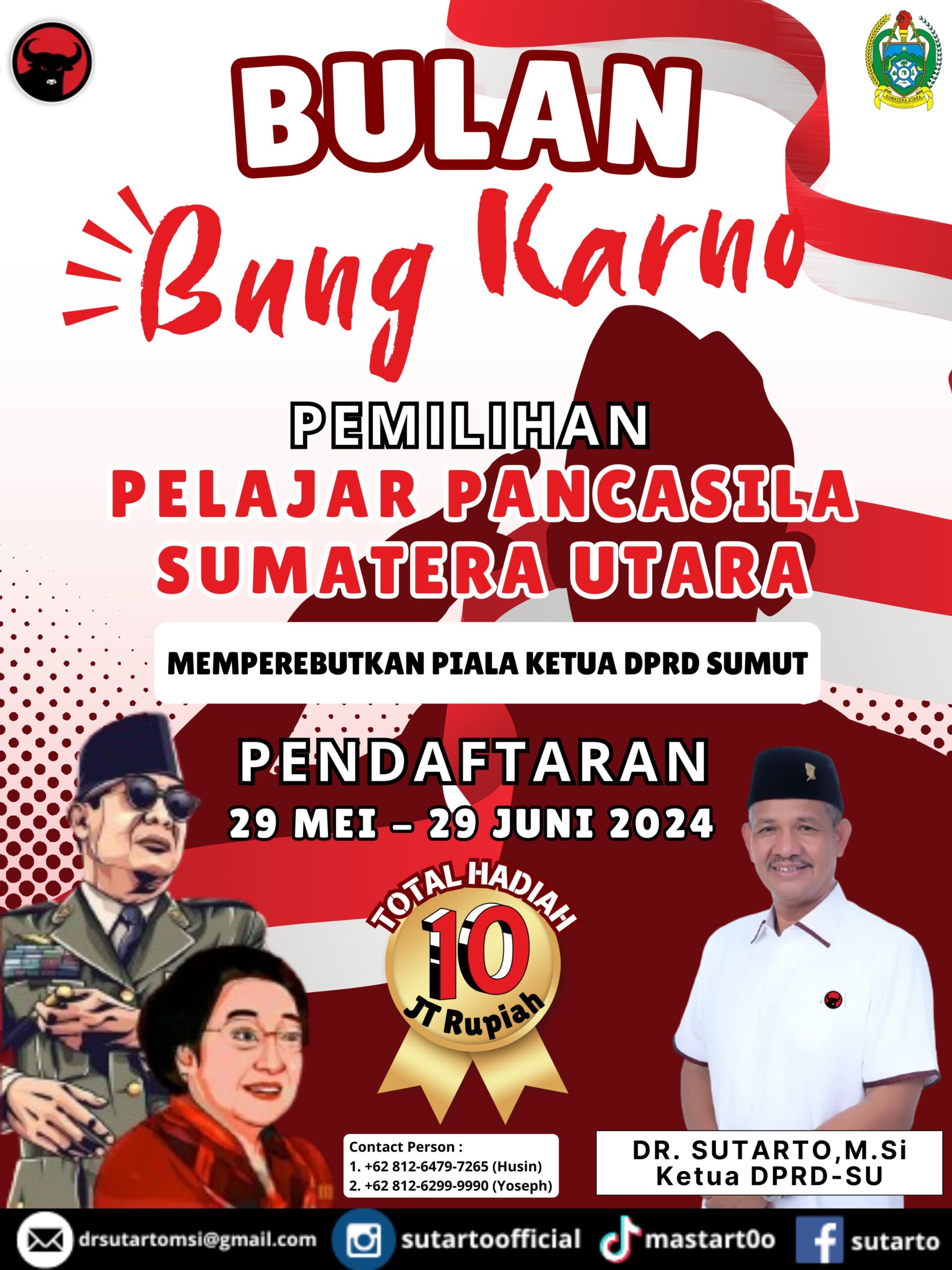 Ketua DPRD Sumatera Utara, Sutarto, yang juga Sekretaris DPD PDI Perjuangan Sumut, mengajak seluruh pelajar SMA sederajat di Sumatera Utara untuk berpartisipasi dalam Pemilihan Pelajar Pancasila.
