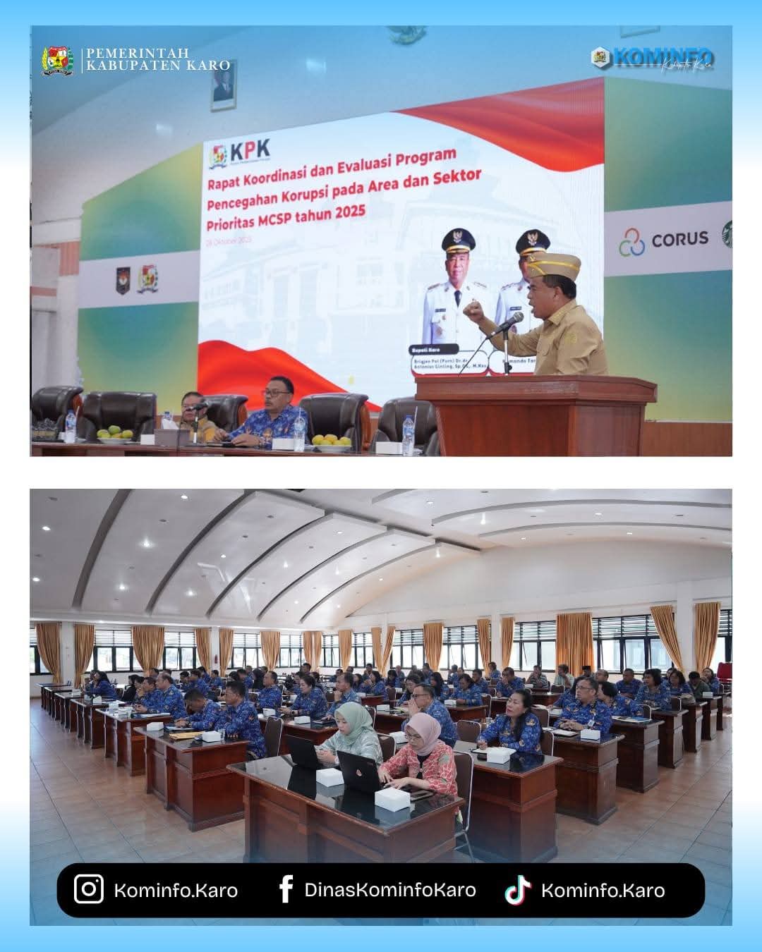 Karo (MAWARTA) – Pemkab Karo bersama Kedeputian Bidang Koordinasi dan Supervisi Wilayah I Komisi Pemberantasan Korupsi (KPK) RI menggelar Rapat Koordinasi dan Evaluasi Program Pencegahan Korupsi pada Area dan Sektor Prioritas MCSP (Monitoring, Controlling, Surveillance for Prevention) Tahun 2025, bertempat di Aula Kantor Bupati Karo, Selasa (28/10/2025).