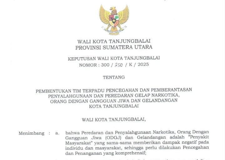 TANJUNGBALAI – Pemerintah Kota Tanjungbalai resmi menerbitkan Surat Keputusan Wali Kota Tanjungbalai Nomor 300/250/K/2025 tanggal 18 Juni 2025 tentang Pembentukan Tim Terpadu Pencegahan dan Pemberantasan Penyalahgunaan dan Peredaran Gelap Narkotika (P4GN), serta Penanganan Orang Dengan Gangguan Jiwa (ODGJ) dan Gelandangan di Kota Tanjungbalai.