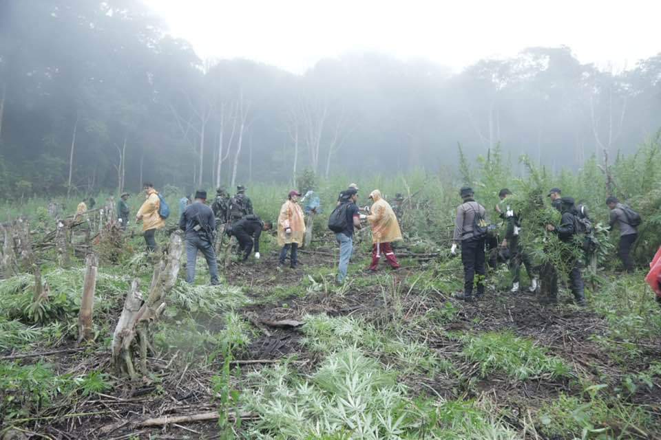 Badan Narkotika Nasional (BNN) Republik Indonesia melakukan pemusnahan ladang ganja seluas 1 Hektar pada ketinggian 1.300 MDPL di Desa Pulo, Kecamatan Seulimeum, Kabupaten Aceh Besar, Senin (2/10).
