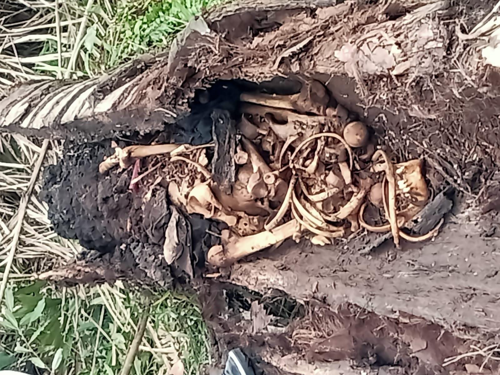 “Ada pohon aren tumbang, retak, lalu saya buka. Ternyata terlihat tulang manusia. Setelah itu kami panggil warga dan kepala dusun. Kami juga belum tahu kerangka itu milik siapa,” ungkap Riyan.