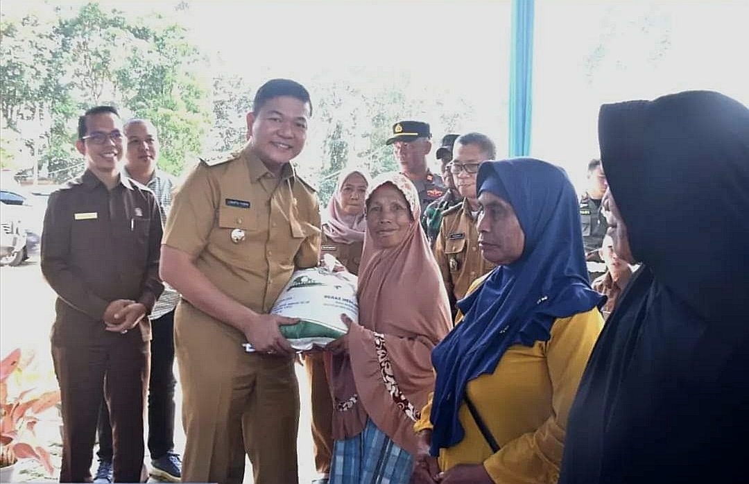 Pj. Wali Kota Pagar Alam Lusapta Yudha Kurnia secara simbolis menyerahkan bantuan Cadangan Pangan Pemerintah (CPP), kepada 691 Kepala Keluarga (KK) yang tersebar di Kecamatan Dempo Selatan Senen ( 09/10/2023).