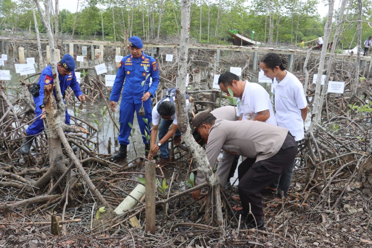 Polda Sumut bersama Pemprov beserta stakeholder terkait menanam 10.000 bibit pohon magrove di Desa Lubuk kertang, Kecamatan Brandan Barat, Kabupaten Langkat, Kamis (12/10).