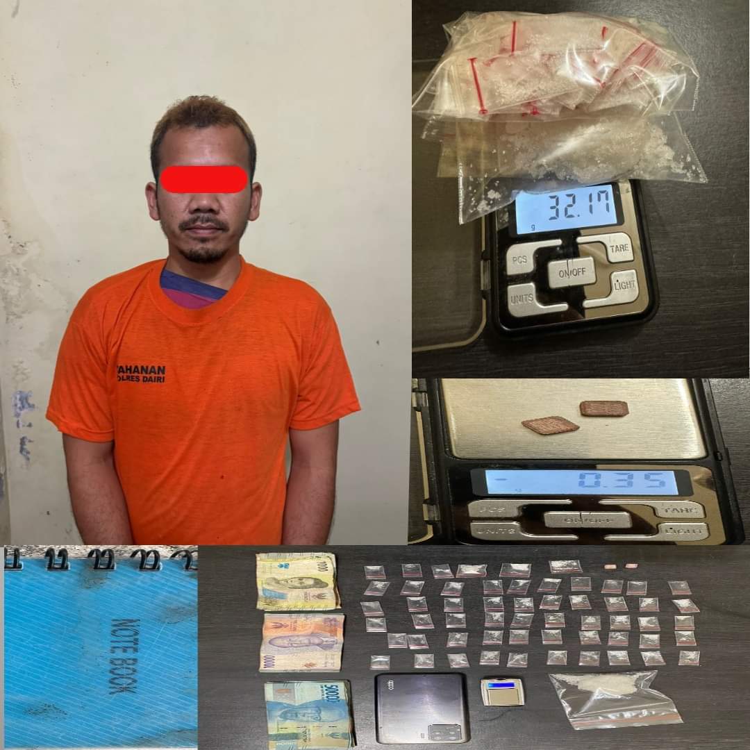 DAIRI – Sat Res Narkoba Polres Dairi berhasil meringkus RMT (31), seorang pengedar narkoba, di sebuah gubuk di Desa Harapan, Kecamatan Tanah Pinem, Kabupaten Dairi. Penangkapan ini dilakukan atas kepemilikan narkoba jenis sabu seberat 32,17 gram.