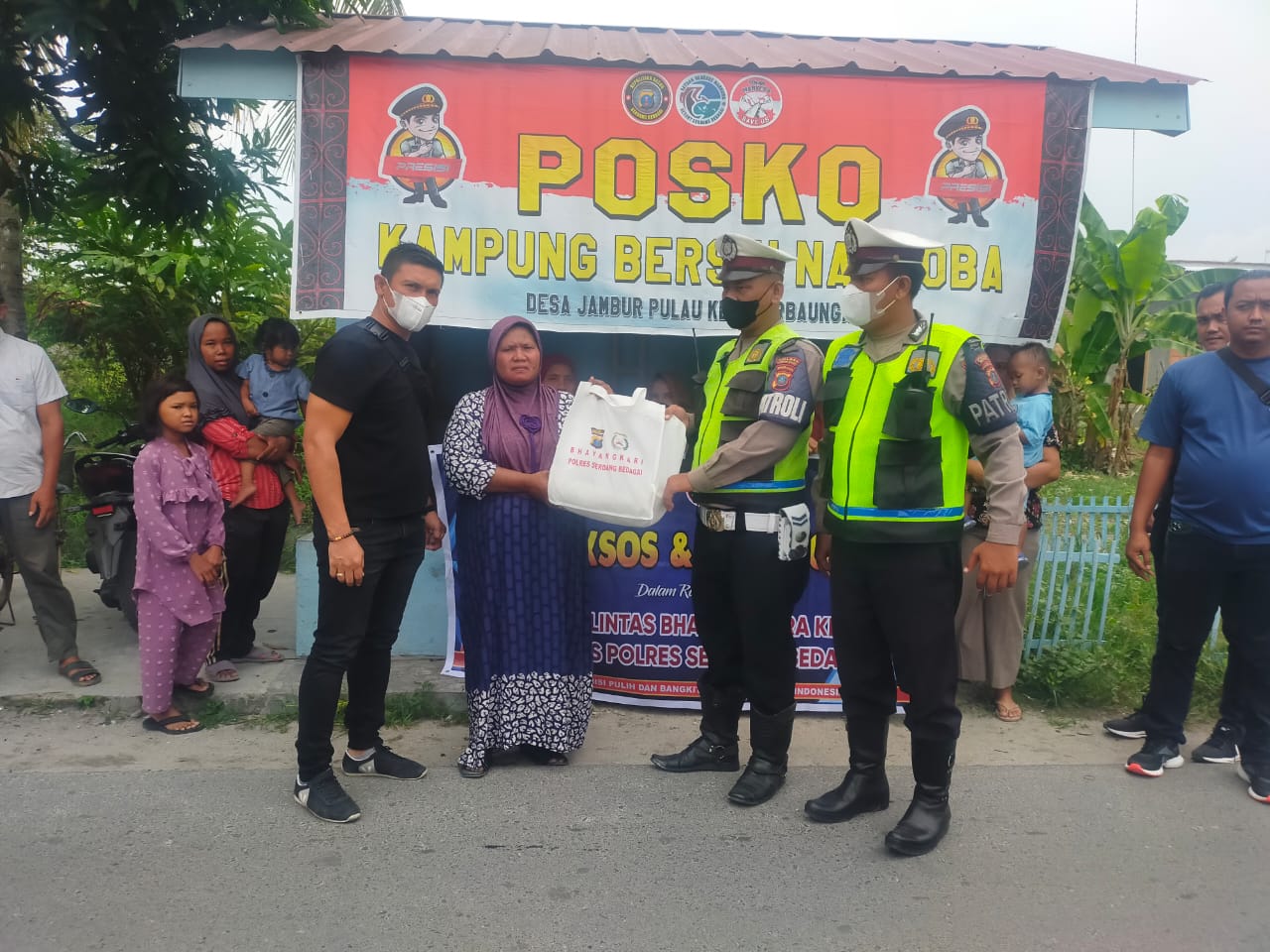 Kapolres Sergai AKBP Dr. Ali Machfud S.IK. M.IK diwakili Kanit I Saat Narkoba Polres Sergai IPDA Anggiat Sidabutar SH bersama personel Unit I Sat Narkoba, berikan bantuan sembako yang di Posko Kampung Tangguh Anti Narkoba di Dusun I Desa Jambur Pulau (Jampul), kecamatan Perbaungan, Kabupaten Sergai, Jum’at (9/9/2022).
