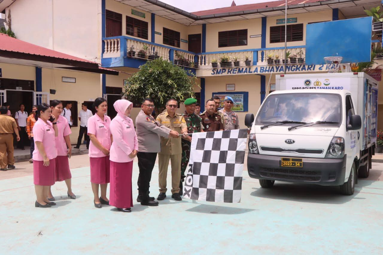 Karo – Polres Tanah Karo bersama Yayasan Kemala Bhayangkari Cabang Tanah Karo meresmikan Satuan Pelayanan Pemenuhan Gizi (SPPG) Karo I di SMP Kemala Bhayangkari 2 Kabanjahe, Senin (22/9). Peresmian ditandai dengan penyerahan simbolis makanan bergizi kepada siswa serta peluncuran kendaraan PPG.