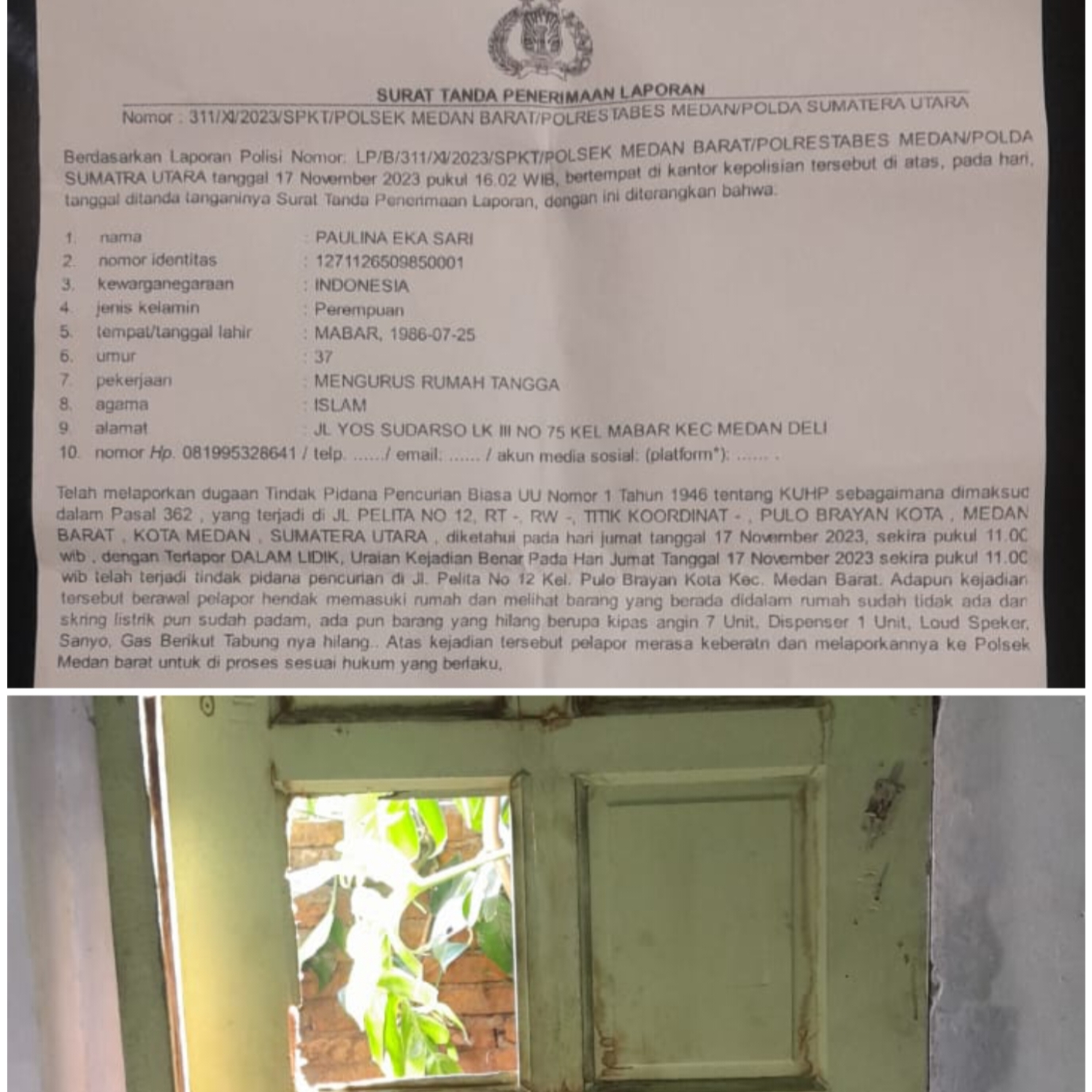 Rumah Ruko tempat Usaha Reflesi Aulina yang berada di Jalan Pelita Nomor 12 Kelurahan Pulo Brayan Kota Kecamatan Medan Barat, di Bobol Maling Jumat tanggal 17 November 2023. Sekitar pukul 02 : 30 WIB.