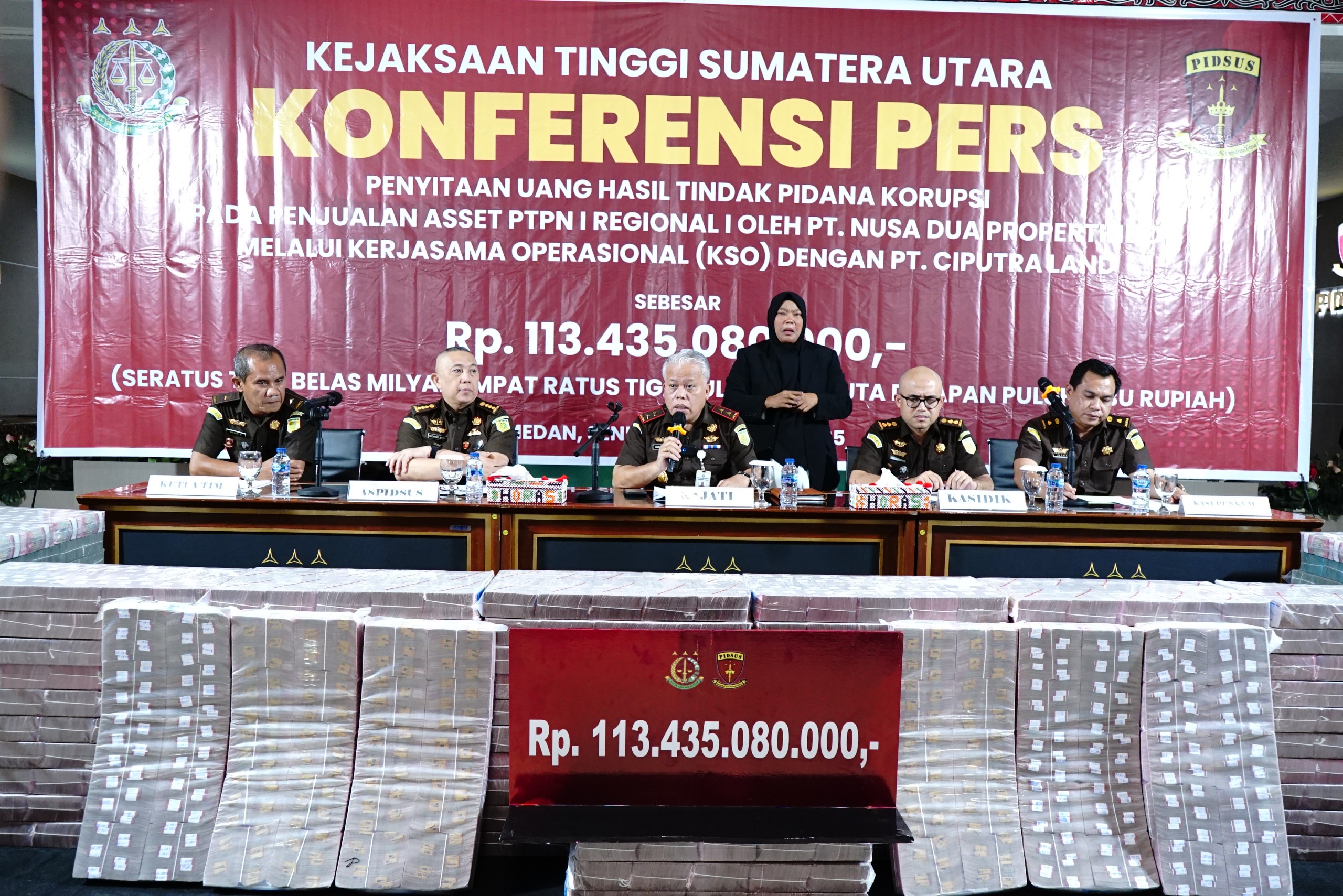 Medan (MAWARTA) – Kejaksaan Tinggi Sumatera Utara kembali menerima pengembalian kerugian negara dari PT Nusa Dua Propertindo (PT NDP) sebesar Rp113.435.080.000.