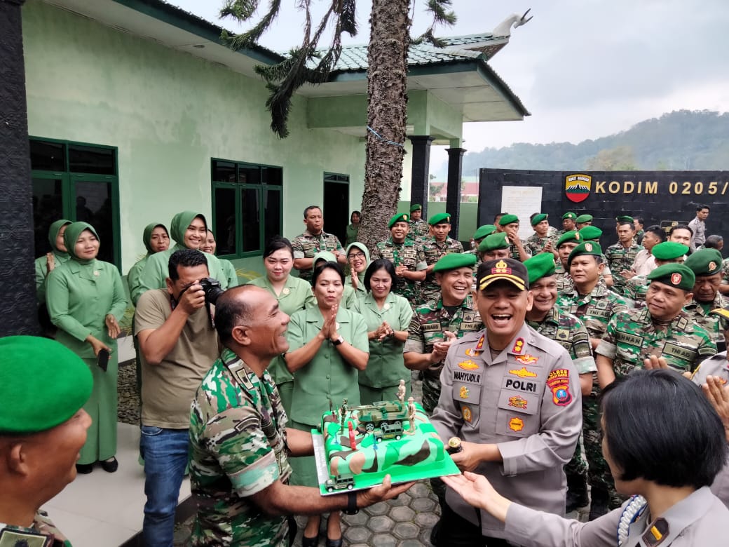 Kapolres Tanah Karo AKBP Wahyudi Rahman menyerahkan kue ulang tahun TNI ke Kodim 0205/TK didampingi Pejabat Utama menyerahkan kue ulang tahun kepada Dandim 0205/TK Letkol Ahmad Afriyan Rangkuti yang diwakili Kasdim Mayor Cba J Siboro .