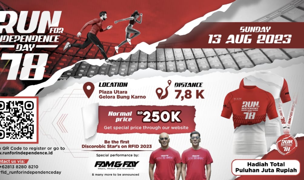Lomba lari Run for Independence Day (RFID) kembali hadir pada tahun 2023 dan akan digelar pada 13 Agustus di Plaza Utara, Gelora Bung Karno, Jakarta.