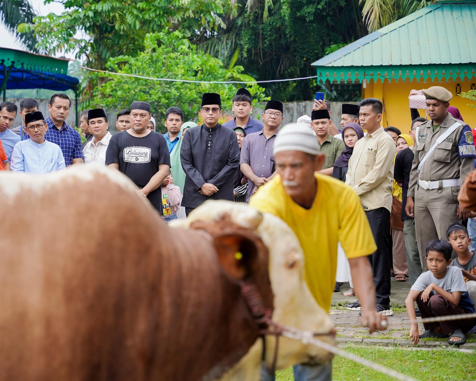 MEDAN – Wali Kota Medan Rico Tri Putra Bayu Waas menyaksikan penyembelihan sapi kurban Presiden Prabowo Subianto, Sabtu (7/6/2025) di halaman belakang Masjid Raya Al Osmani, Kecamatan Medan Labuhan.
