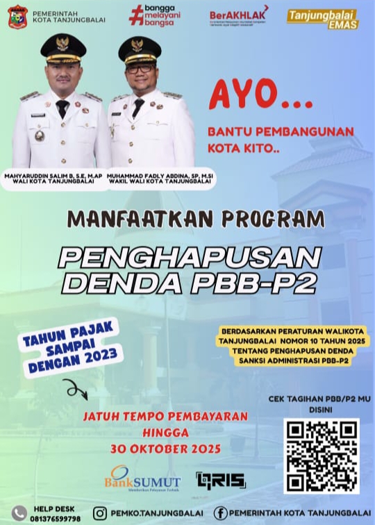 Penghapusan denda PBB-P2 tersebut berdasarkan Peraturan Wali Kota Tanjungbalai Nomor : 10 Tahun 2025 tentang penghapusan denda sanksi administrasi pajak bumi dan bangunan perdesaan dan perkotaan (PBB P2) yang berlaku sampai dengan tanggal 30 Oktober 2025.