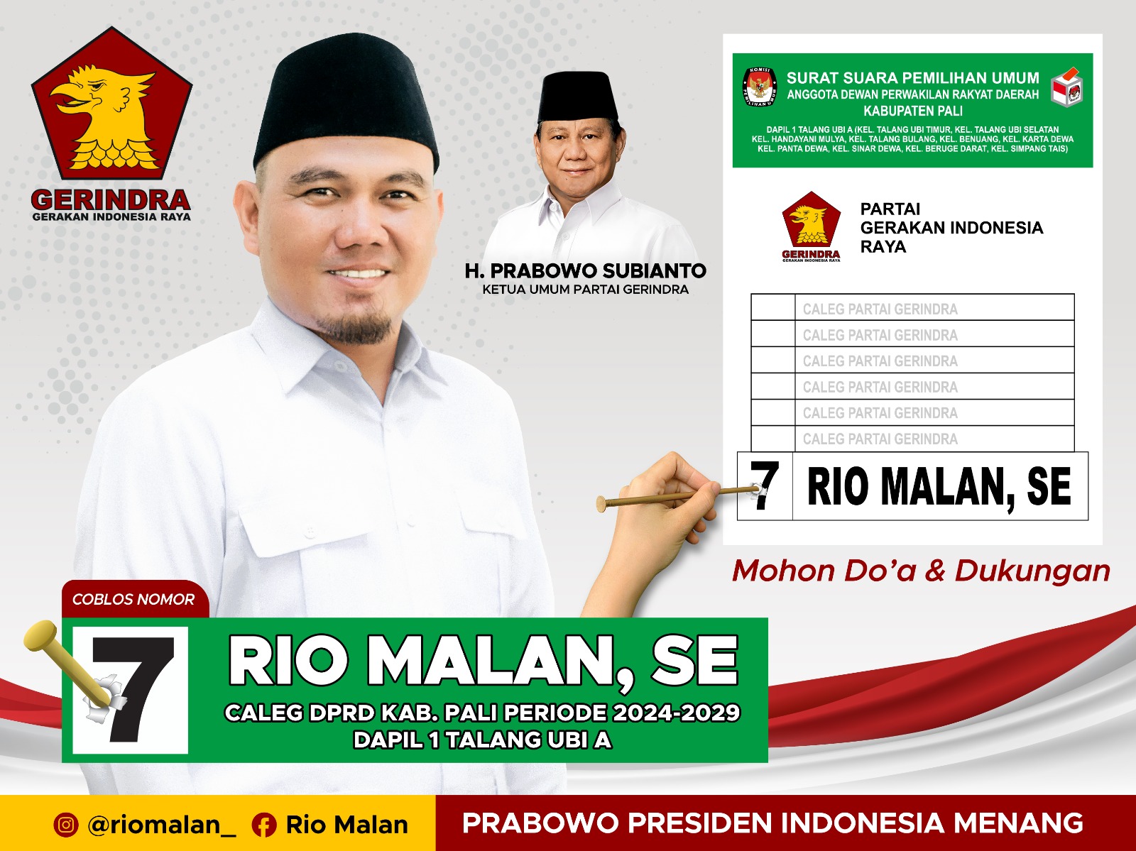 Rio Malan SE, calon legislatif dari Partai Gerindra Nomor Urut 07 di daerah pemilihan Talang Ubi 1, Kabupaten Penukal Abab Lematang Ilir (PALI), mengungkapkan rasa syukur dan terima kasih kepada pendukungnya atas suksesnya dalam pemilihan legislatif.