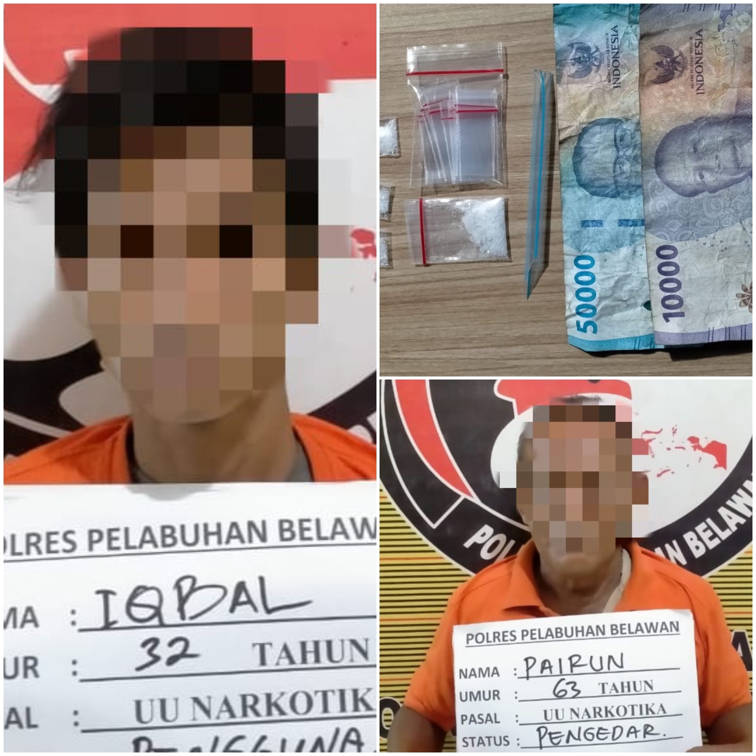Dua tersangka yang diamankan yakni Pairun (63) sebagai pengedar dan Iqbal (32) sebagai pengguna. Dari hasil penggerebekan, polisi mengamankan barang bukti berupa 4 plastik klip berisi shabu, 1 bungkus plastik klip kosong, dan uang tunai sebesar Rp 60.000,-.