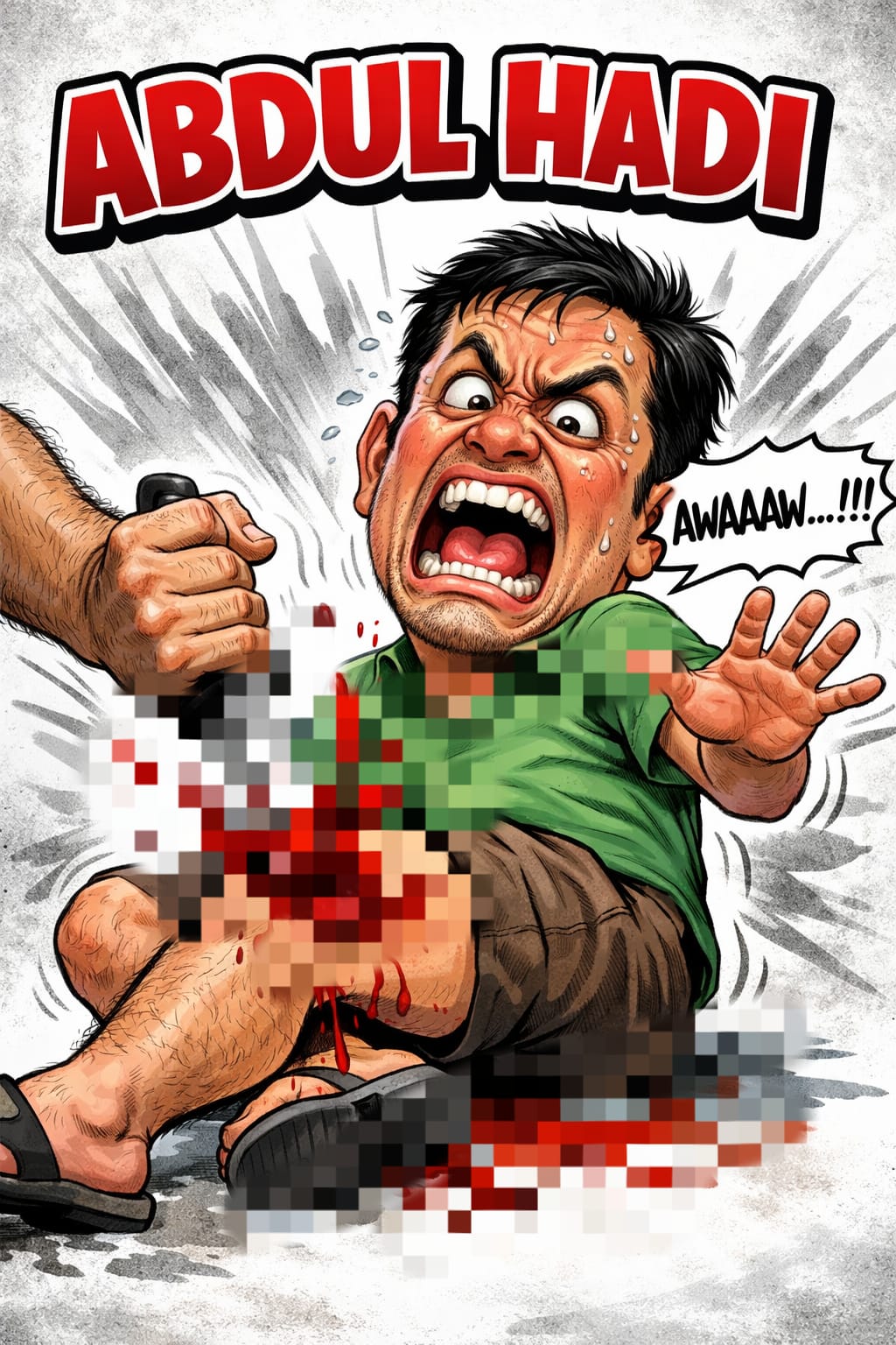 Tikaman tersebut menghujam paha kanan Abdul Hadi hingga membuatnya terjatuh dari sepeda motor.