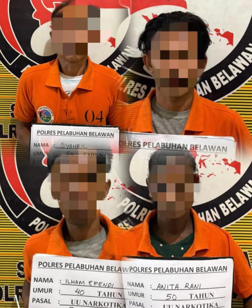 Keempat tersangka yang diamankan yakni Syahril (54) sebagai pengedar, serta Anita (50), Ilham (40), dan Tabri (35) sebagai pengguna narkotika.