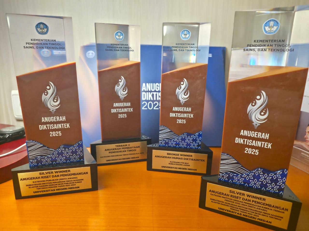 Empat penghargaan yang diterima Unimed yakni 1) Medali Silver Kategori Peningkatan Kinerja Terbaik (Sinta Award), 2) Medali Silver Kategori Publikasi (Sinta Award), 3) Terbaik 2 Pengelola Beasiswa ADIK, dan 4) Medali Bronze Anugerah Humas (website).