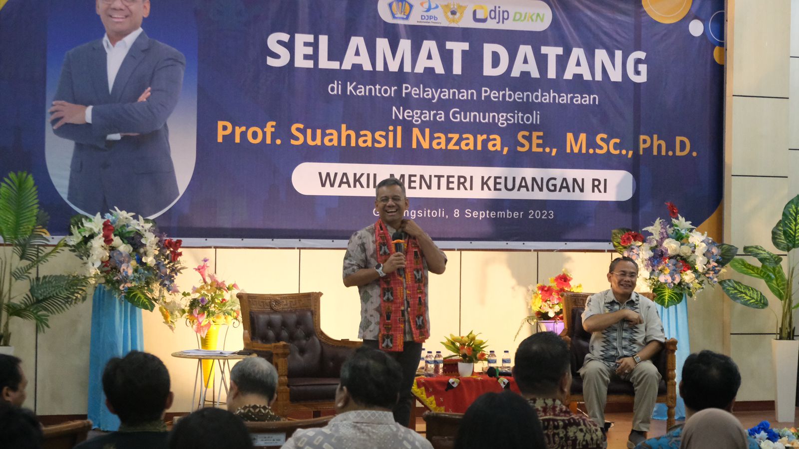 Wamenkeu Suahasil Nazara memberi sambutan di KPPN Gunung Sitoli. (Istimewa).